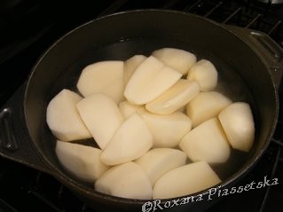 Cuire dans l’eau froide les pommes de terre préalablement épluchées et coupées en morceaux pendant 20min après ébullition. Quand les pommes de terre sont cuites, la pointe d’un couteau s’enfoncera dedans sans résistance. |